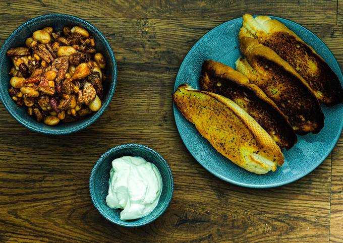 - Then comes the rinsed & sieved beans, sweet corns, tomatoes while searing with salt and pepper to taste. Simmer for about 10 minutes. Serve on garlic bread toast with soured cream.